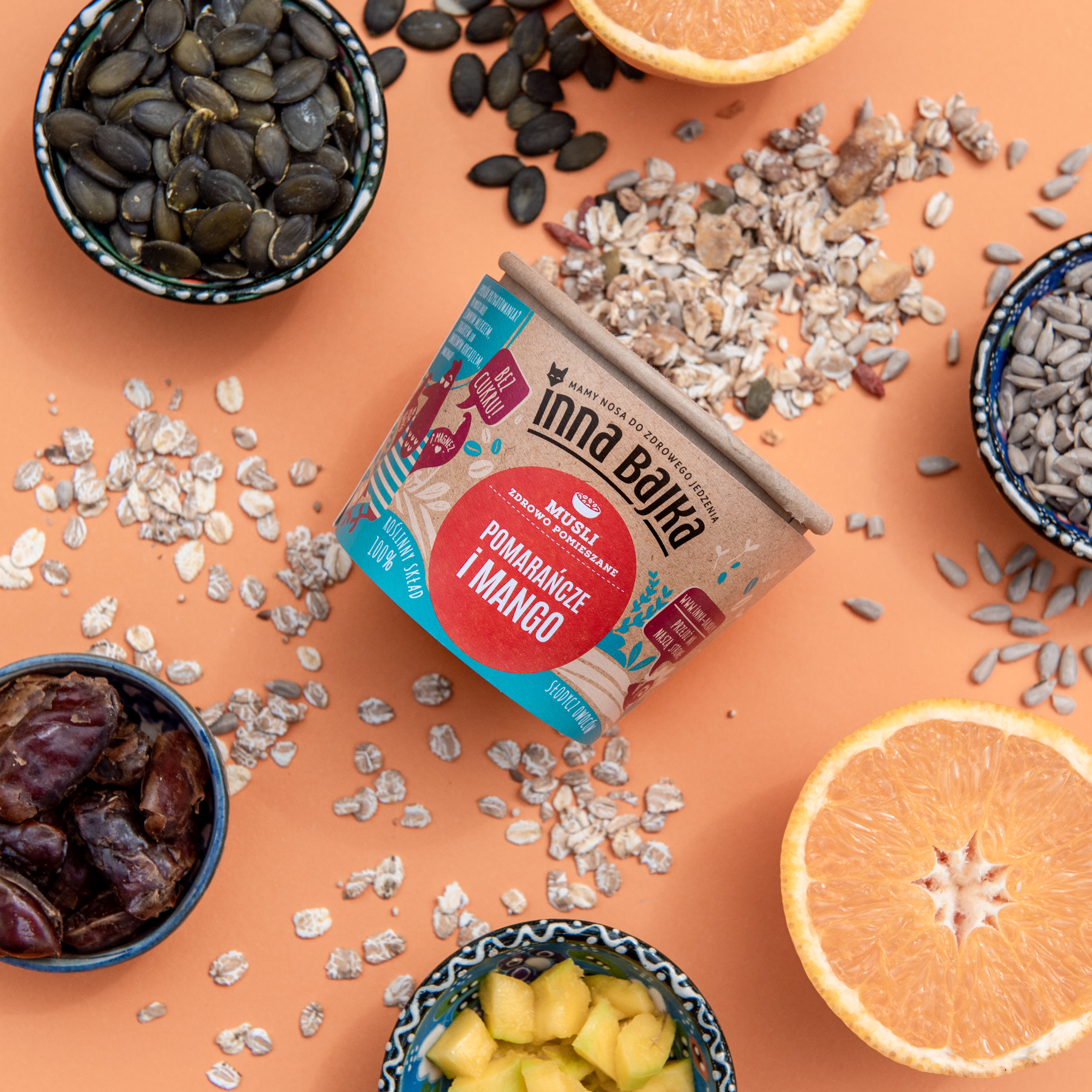 MUSLI POMARAŃCZE I MANGO – Zawsze pod ręką! Kwaśno słodki duet pełen witamin i słonecznego smaku lata? Tylko u nas wyśmienita mieszanka owoców w towarzystwie jagód goji, nasion słonecznika, pestek dyni oraz różnorakich opiekanych płatków! Jeśli szukasz dobrego i smacznego źródła witaminy C oraz Magnezu, to jesteś w odpowiednim miejscu!