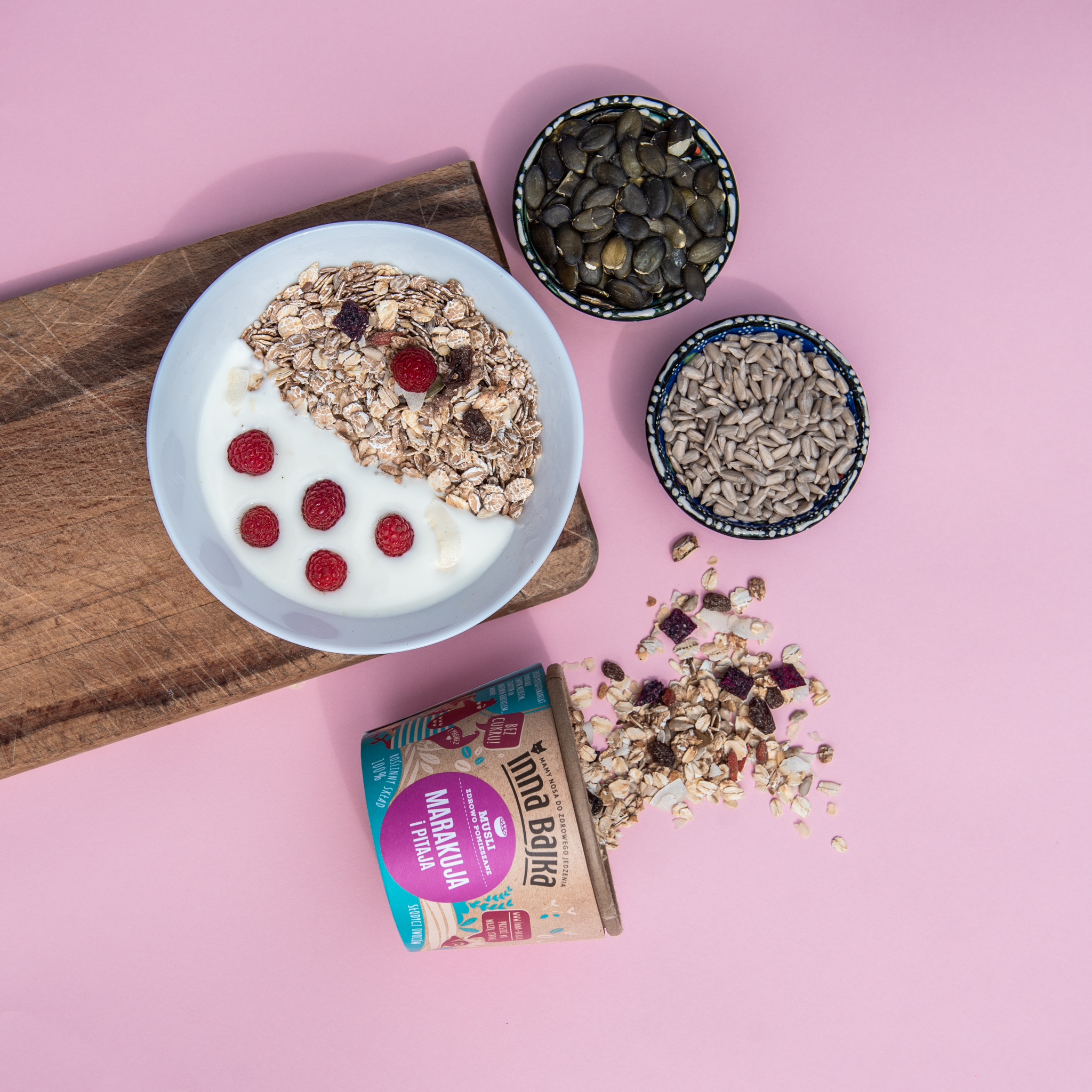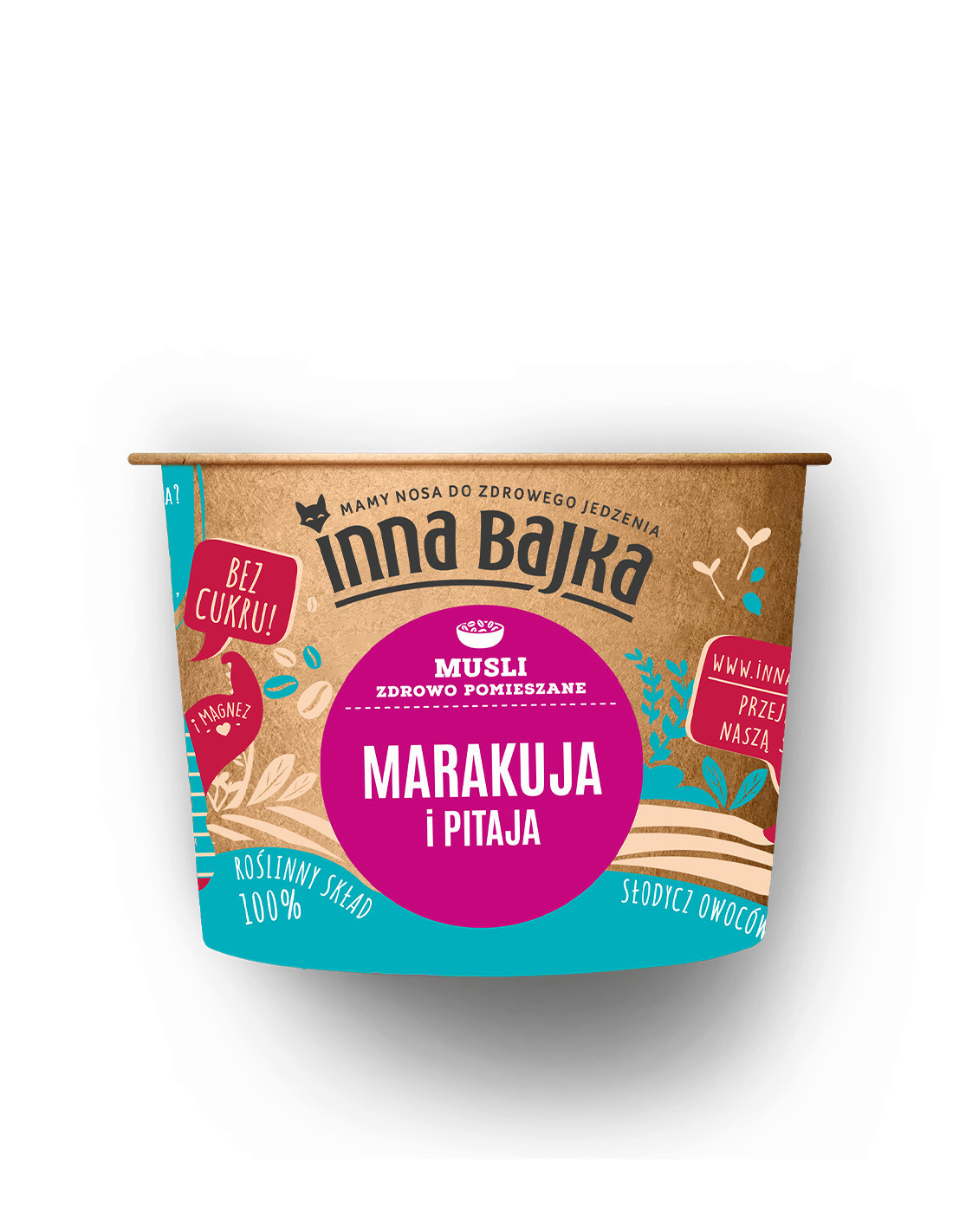 MUSLI MARAKUJA I PITAJA – Zawsze pod ręką! A może garść tropików na śniadanie? Naszą słoneczną kompozycją musli wprowadzamy szczyptę tropikalnego szaleństwa. W tej odsłonie poznaj fioletową pitaję zwaną inaczej truskawkową gruszką (ha!) z owocem marakuji. Jesteśmy dumni z tego połączenia. Nasze musli dostarczy Ci potrzebnego błonnika, a mangan przyczyni się do utrzymania kości w dobrym stanie. Na zdrowie!