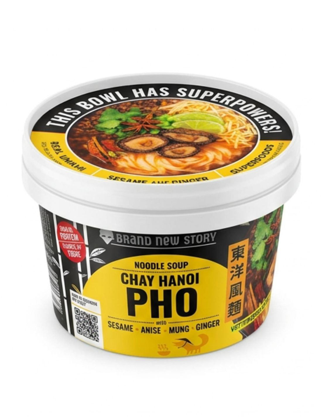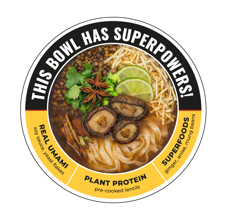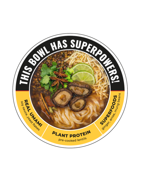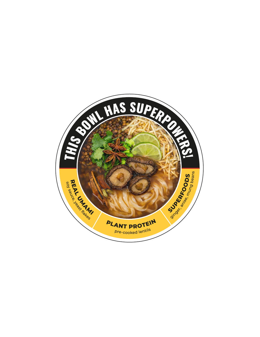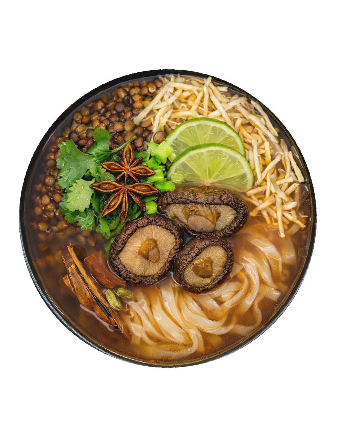 Aromatyczna zupa pho inspirowana kuchnią Wietnamu – lekka, wyrazista i pełna przypraw. Z makaronem ryżowym, soczewicą i kiełkami fasoli mung. Wegańska zupa instant o głębokim smaku bulionu i naturalnym umami.