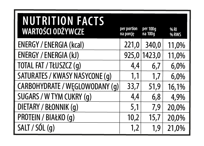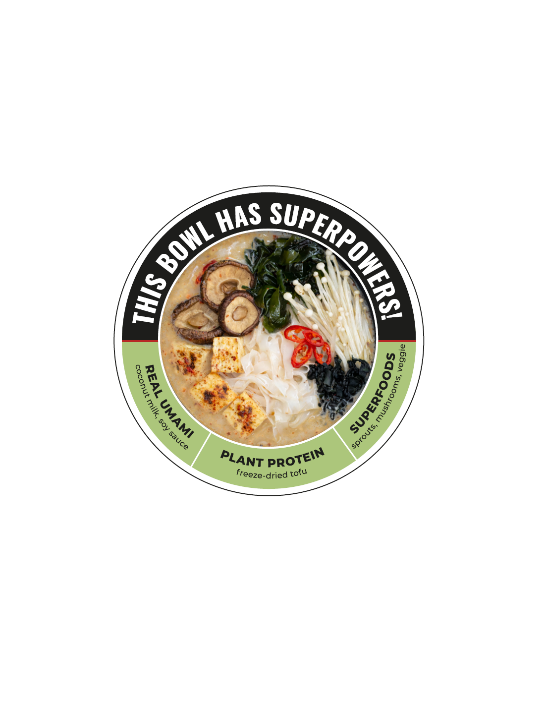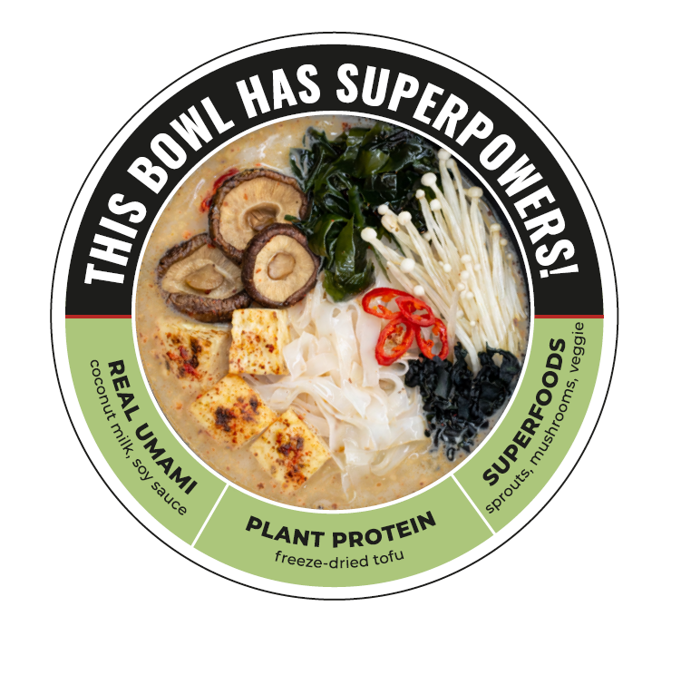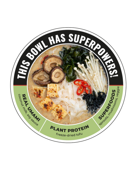 Dzięki liofilizowanemu tofu i bogatej kompozycji składników to nie jest zwykła zupa instant, ale pełnowartościowy posiłek. Naturalne białko roślinne sprawia, że ramen jest sycący i dobrze zbilansowany – idealny na lunch, kolację albo „coś ciepłego” w ciągu dnia.