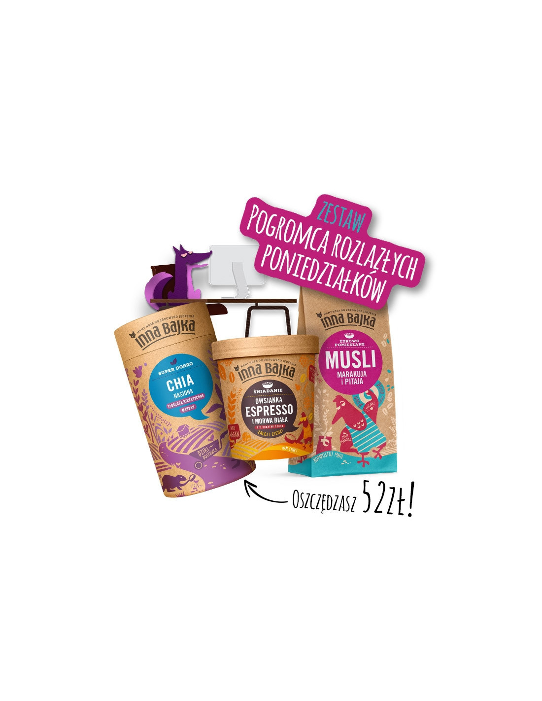 Pogromca Rozlazłych Poniedziałków to zestaw idealnie stworzony do zaspakajania głodu w pracy. 7 produktów śniadaniowych oraz 7 lunchowych plus nasiona chia stanowiące doskonały dodatek do napojów, słodkie Koko-Czoko które da Ci energię każdego dnia oraz Granola Czekolada i Truskawki i Musli Marakuja i Pitaja jako pyszny deser. Z tym zestawem nigdy więcej nie zaznasz rozlazłych poniedziałków!
